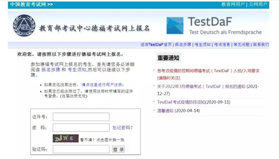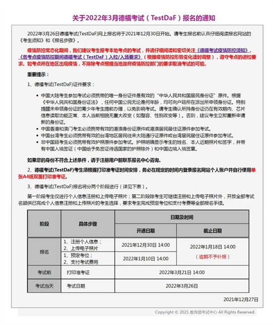 2022年3月26日的德福考试,今日开放注册,1月10日开放预定及支付费用。